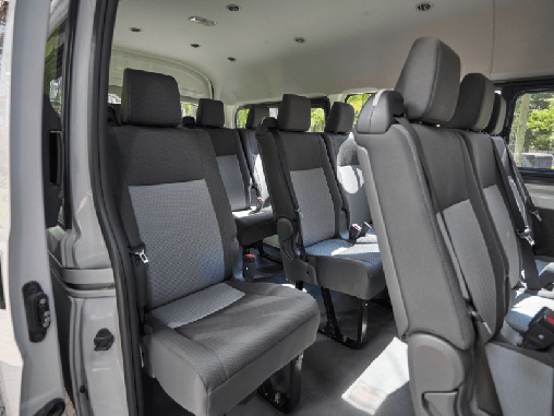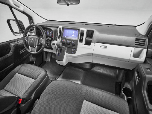 Os assentos da Hiace são projetados para oferecer conforto e ergonomia, com capacidade para 15 passageiros e uma fileira de bancos dobráveis que facilita o transporte de bagagens. O ar-condicionado traseiro possui saídas individuais bem distribuídas, garantindo uma temperatura agradável para todos os ocupantes.